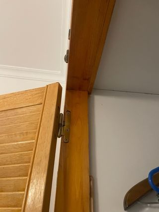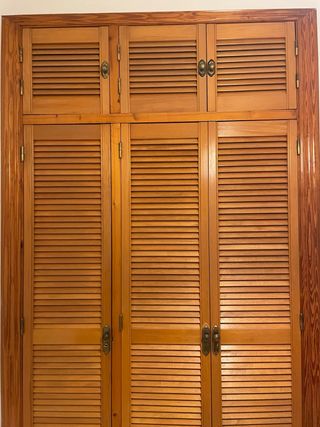 Frente de armario con puertas de persiana en madera. - Diseño de lamas. - Acabado en madera natural. -140,5 cm de ancho x 230cm de alto - puertas izqda: superior 50cm ancho x 40 cm alto, inferior 50cm ancho x180cm a - puertas central y dcha: superior 40cm ancho x 180cm alto - tapajuntas de 10 cm Tengo 2 armarios con las mismas medidas Y 1 armario con las 6 puertas de 40cm de anchura ( medida del frente: 132 de ancho x 230 de alto) Precio a confirmar por lote