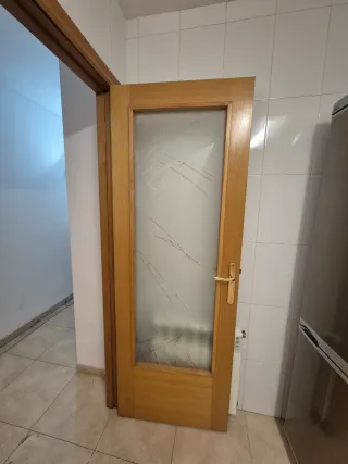 Puerta de madera maciza Norte con acabado lacado. Perfecto estado, sin golpes ni rayadas. - Diseño clásico con molduras. - Color madera natural. Se incluyen manetas y bisagras Precio por unidad. Hay 4 puertas de 72x202cms Hay 1 puerta de 62x202cms Hay 2 puertas con cristal de 72x202cms