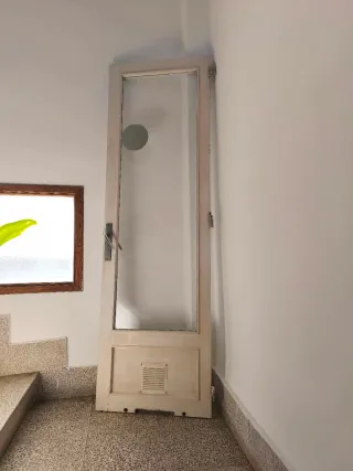 Vendo puerta interior de madera lacada en blanco, originalmente utilizada para comunicar cocina y cuarto de colada. Está en buen estado y es ideal tanto para su uso original como para proyectos de decoración o reforma. Características principales: Diseño: Estructura de madera con un gran panel de cristal translúcido que aporta mucha luminosidad. Ventilación: Incluye rejilla de aireación en la parte inferior, perfecta para cocinas, despensas o lavaderos. Ancho y alto:61'5 y 200cm. Incluye manivela funcional de estilo metálico y bisagras. Estado: Usada pero bien conservada. Escucho ofertas.
