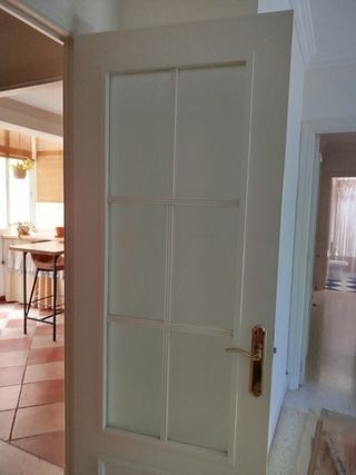 Se venden puertas de paso blancas con diseño de cristal.Y ciegas de paso..2 puertas ciegas y una sencilla de cristales y una doble de cristal. Una de las ciegas de paso está dañada. Hay fito - Diseño de 6 paneles de cristal. - Marco de madera blanco. - Tirador metálico incluido y bisagras