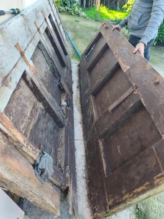 Conjunto de puertas antiguas de madera, procedentes de una casa de pueblo. Ideales para proyectos de restauración o decoración rústica. 125 años de antigüedad, con herrajes de época. - Madera maciza. - Diseño tradicional.