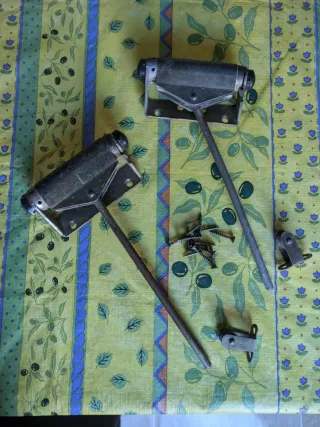 Vendo dos cierrapuertas mecánicos de brazo, diseñados para que la puerta se cierre sola automáticamente. Tienen un acabado antiguo en bronce muy difícil de encontrar hoy en día, ideal para quienes buscan mantener una estética clásica o rústica en casa. Uso: Perfectos para puertas de madera, despensas o armarios grandes donde se quiera asegurar el cierre. Material: Metal sólido y resistente. Incluye: 2 sistemas completos con sus soportes y tornillos de época. Estado: Funcionando y con una pátina antigua muy bonita.