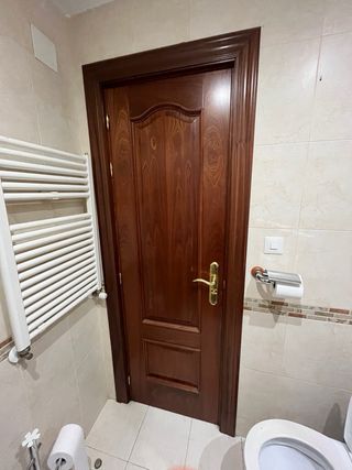Puerta de madera de interior (medidas estandares) con un diseño clásico y elegante. 2.01 de alto. He subido fotos de la medida para clarar tanta pregunta. Las medidas estandares actualmente son esas, o 72.5 o 62.5 de ancho. Las 4 por 80€. - 3 puertas de 72.5 cm de ancho (2 puertas opacas y 1 con cristal-de cocina) y puerta 1 de 62.5 ancho (la del baño). - Acabado en madera oscura. - Incluye manilla dorada.