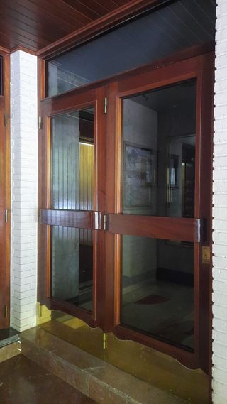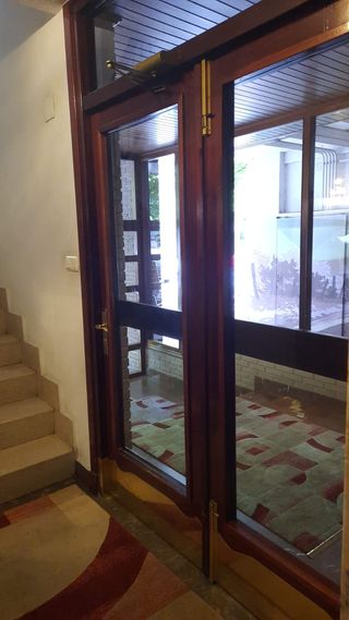 Puerta de calle / portal de madera maciza de Iroko con dos hojas y cristal, protección y embellecido en la parte baja interior y exterior con metal dorado. Con muelle marca Dorma. En buen estado. Se vende porque se va a hacer obra. Medidas: 0,85 m. de ancho / hoja. 2,18 m. de altura / hoja. Hay más mobiliario a la venta. Disponibilidad aproximada: septiembre de 2026. ENTREGA EN MANO - NO SE ENVÍA