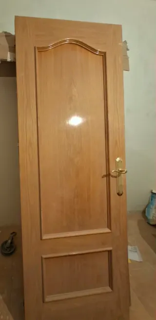 Se venden puertas de interior de madera, ideales para cualquier hogar. - Diseño clásico con paneles. - Acabado en madera clara. - Incluyen manillas doradas.