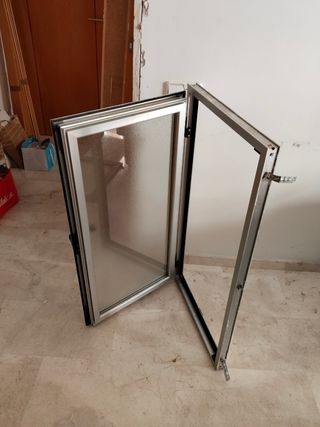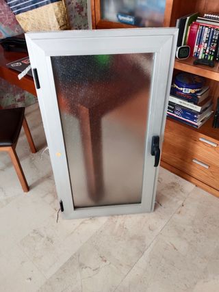 Ventana estupenda de aluminio con cristal translúcido, que no deja ver bien lo que hay al otro lado, pero permite el paso de la luz. La hoja es abatible, y mide 55x105 cm, y lo que es toda la estructura, 60x110 cm. Abre y cierra perfectamente. La vendo porque he tirado la pared donde estaba ubicada. Tambien vendo una puerta del mismo tipo.