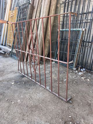 Reja de metal con diseño ornamental. - Medidas: 1,20 metros de alto por 1,60 metros de ancho - Estructura de barrotes verticales y detalles decorativos. - Color óxido.