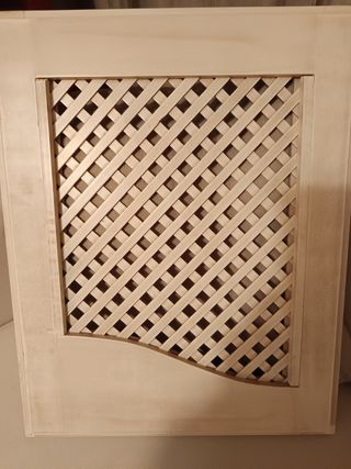 Puerta de madera con diseño de reja. - Material: Madera. - Diseño: Reja cruzada.