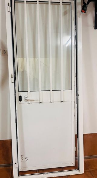 Puerta de aluminio blanca con reja de seguridad. Medida 210x80 cm - Marco y puerta de aluminio. - Reja metálica blanca. - Manilla plateada.