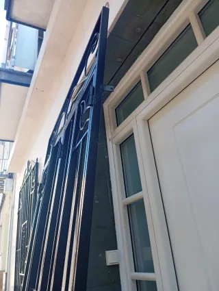 Conjunto de rejas de hierro forjado con un diseño ornamental. - Estructura robusta de metal. - Detalle de volutas decorativas.