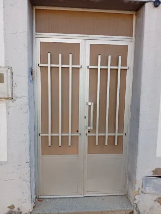 Puerta de aluminio de doble hoja con un diseño moderno y seguro. - Material: Aluminio. - Diseño: Dos hojas con paneles superiores e inferiores. - Seguridad: Incorpora rejas verticales en la parte superior de cada hoja.Negociable.... Dimensiones 1,35 ancho 2,10, alto