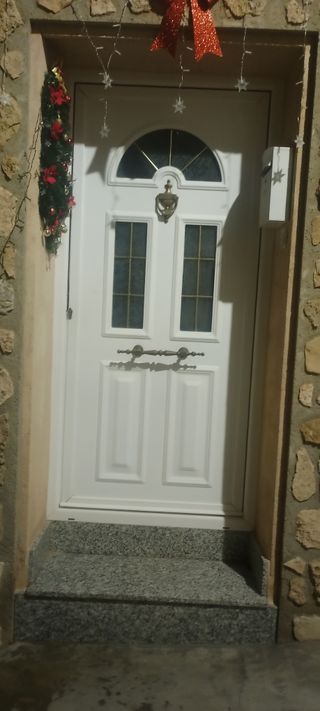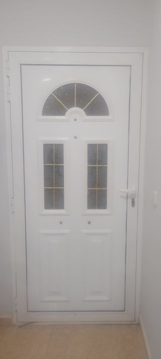 Puerta de aluminio con cristal climalit y reja de hierro. - Aluminio blanco - Cristal climalit. - Reja de hierro forjado con diseño. - hueco ...0,82 × 1,91 MT.