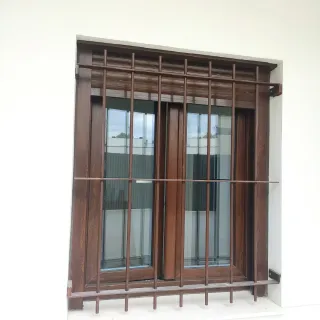 Ventana de doble acristalamiento con persiana enrollable y reja de seguridad. - Marco de madera. - Doble cristal (Climalit). - Persiana enrollable integrada. - Reja de seguridad exterior.