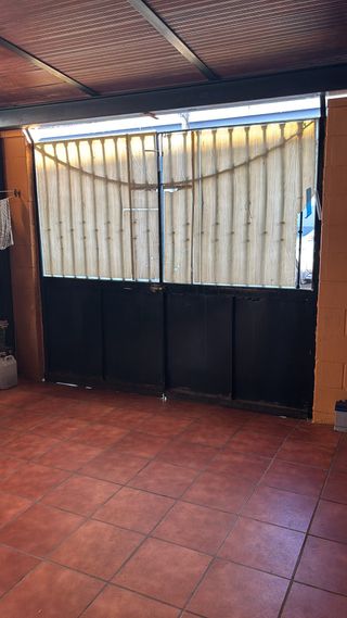 Puerta de aluminio con postiguillo. Una hoja y cerradura. Las gomas están desgastadas por lo que habrá que cambiarlas. De ahí su precio. - Material: Aluminio y cristal. - Medidas 89cm x 196cm El marco está metido un poco en la pared, así que dará algún centímetro más. Precio no negociable. Venta en persona.