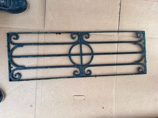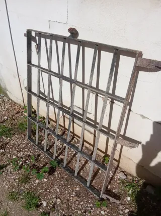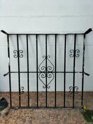 Reja de hierro para ventana o puerta. Medidas aprox.: 120 cm alto x 90 cm ancho. Estructura fuerte y pesada, no es chapa fina. Tiene algo de óxido superficial por el uso, ideal para lijar y pintar. Incluye anclajes laterales para instalación. Perfecta para vivienda, patio, trastero o seguridad exterior.
