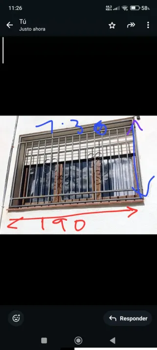 Reja hueco ventana de 120 cm ancho y 115 alto (aprox) pasamano de 4cm y redondo de 2cm