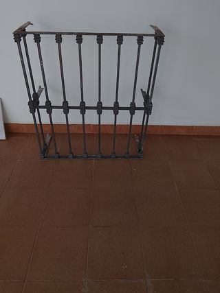 Reja de hierro forjado con diseño clásico. - Estructura robusta de metal. - Barras verticales y detalles ornamentales superiores.