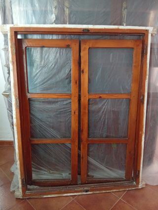 Conjunto de reja y ventana fabricada en madera. - Marco de madera para encastrarlo en obra. - Paneles de vidrio. - Ventana de 1'50 alto x 1'15 ancho. - Reja de 1'50 alto (+ adorno) x 1'30 ancho. - Reja y ventana se encuentran en Colmenar.