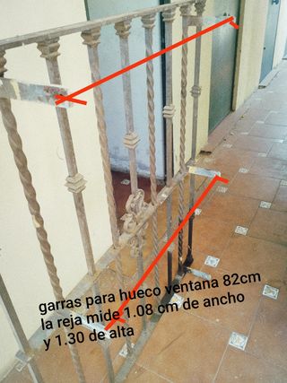 Una reja sin estrenar, de 121,5 ancho x 115, color gris, hecha con tubo redondo, y muy pesada. Está nueva, y es muy segura. No tiene garras, sino que se fija con tornillos. Los agujeros se ven en la foto.