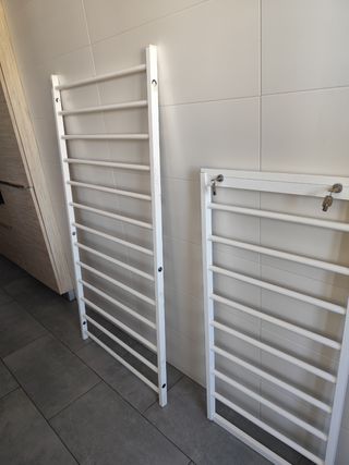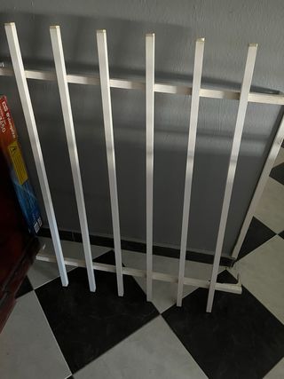 REJAS ABATIBLES, DE TIJERA. (Solo me queda la mas pequeña) De seguridad. Blancas, fuertes y resistentes. La más pequeña mide 96x179 cm aproximadamente. La grande tiene de alto 205 cm, y el ancho unos 114 cm aproximadamente. Tiene cerradura, aunque supongo que habría que cambiar el bombín para ponerle llave nueva. Son muy seguras. A recoger en Sevilla capital. Pesan bastante, de hierro. Solo al peso ya valdrá mas. Las medidas aproximadas son esas, no entiendo de rejas ni se si encajan en tal sitio. El precio es de 30€. Precio no negociable.