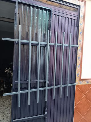Puerta de reja maciza, color gris, con estructura robusta. Ideal para exterior. - Fabricada en metal resistente. - Presenta un acabado en gris, con algunas zonas con pintura blanca. - Se incluye una sola puerta. de entrada 72