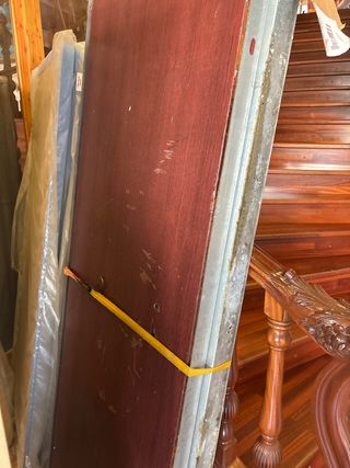 Puerta de madera con marco metálico, ideal para seguridad.Antiocupa ,NO TIENE LLAVE POR ESO EL PRECIO - Color madera oscura. - Marco metálico resistente.