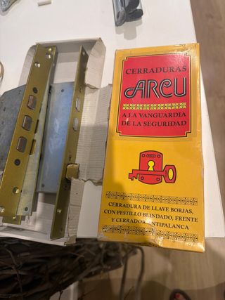 Cerradura de seguridad de la marca Arcu. ( le falta una pieza a la cerradura ) Incluye todos los elementos necesarios para su instalación. - Cerradura principal dorada. - Placa de metal para el marco. - Juego de 4 llaves. - Tornillos de fijación. ( Te lo llevo a la puerta de casa!!!, dentro de barcelona gratis. alrededores de barcelona 5eur + )
