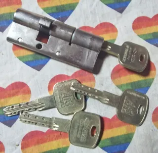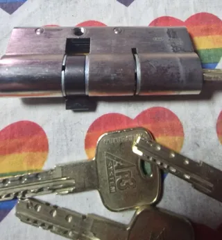 Bombín de seguridad para puerta, en buen estado y con 4 llaves.AZBE - Bombín de latón. - Incluye 4 llaves. - Mecanismo de cierre.no hay envio recojer en mano contesto en el acto largo 6.8