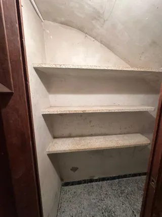 Trastero en planta baja con estanterías de obra, acceso con dos puertas, comunitaria y propia, bajo escalera y espacioso.