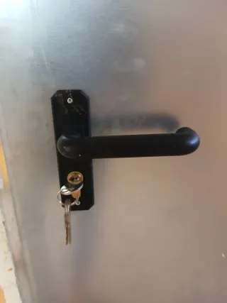 Puerta de trastero con manilla negra y cerradura. Tiene restos de espuma que se quita fácilmente. Es nueva pero necesito una más ancha y por eso la vendo. Costó 110 euros. - Incluye manilla. - Incluye juego de llaves.