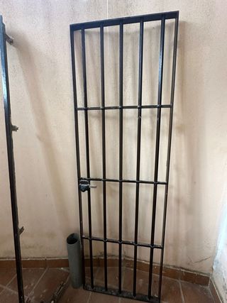 Puerta de hierro con marco incluida. Medidas hoja: 66 cm ancho x 208 cm alto. Medidas marco: 72 cm ancho x 211,5 cm alto. Con cerradura instalada. Ideal para trastero, patio o puerta de seguridad. Buen estado. Se recoge en Pilas.