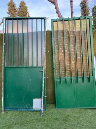 🟢 Puertas de hierro con cristal – Buen estado Se venden dos puertas de hierro con cristal, ideales para entrada de patio, finca, trastero o casa de campo. 📏 Medidas: • Puerta 1: 2,15 m alto x 1,00 m ancho • Puerta 2: 2,10 m alto x 0,94 m ancho Ambas incluyen estructura completa y manilla. Cristal armado/decorativo en buen estado. Estructura fuerte y resistente. Necesitan un repaso de pintura para dejarlas perfectas, pero están sólidas y listas para instalar. 💰 Precio: • 90€ la grande • 100 € la pequeña • 160€ las dos juntas (precio negociable) Se pueden ver sin compromiso.