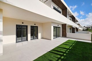 Impresionante bungalow en planta baja en esquina, con orientación sur, muy luminoso y con amplias terrazas, ubicado en una urbanización moderna con piscinas y zonas verdes en Aguas Nuevas (Sector 25), una de las zonas más demandadas de Torrevieja, con todos los servicios a pocos minutos, como supermercados, restaurantes y paradas de autobús cercanas. La vivienda, construida en 2018, se encuentra en perfecto estado de conservación, con estilo moderno y lista para entrar a vivir. Toda la vivienda cuenta con materiales de primera calidad, lo que aporta un extra de confort, aislamiento y durabilidad. Cuenta con 85 m² construidos distribuidos en 3 amplios dormitorios con armarios empotrados, 2 baños completos (uno en suite), y un amplio salón muy soleado con cocina moderna integrada, creando un espacio abierto, cómodo y muy funcional. La vivienda destaca especialmente por sus magníficos espacios exteriores: Terraza delantera de 45 m² orientación sur con toldo Porche acristalado de 13 m² con amplia zona de estar Terraza trasera privada de 20 m² con toldo Calidades y extras: Carpintería exterior de PVC, mosquiteras en todas las ventanas, armarios empotrados forrados, paredes lisas, iluminación con ojos de buey, puerta de seguridad y aire acondicionado frío/calor por conductos en toda la vivienda. Al ser vivienda en esquina, todas las estancias tienen ventana, incluidos los baños, lo que aporta mucha luz natural y ventilación. Incluye gran plaza de garaje subterránea y trastero amplio de 8 m². La urbanización cuenta con zonas verdes muy cuidadas y 2 impresionantes piscinas comunitarias muy grandes. La vivienda es ideal tanto para vivir todo el año, como para vacaciones o inversión con alta rentabilidad. No esperes más y ven a visitarla, ¡Te encantará! Vivir en Aguas Nuevas y Torrevieja Vivir en Aguas Nuevas es disfrutar de una de las zonas residenciales más valoradas de Torrevieja, conocida por su tranquilidad, seguridad y excelente calidad de vida. Se trata de u