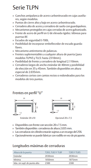 Como nueva- Solo hago envios. Cerradura de seguridad multipunto TLPN. Ganchos antipalanca de acero carbonitrurado en cajas auxiliares, según modelos. Puntos de cierre alto y bajo en acero carbonitrurado. Cerradero alto de acero y cerradero de suelo con guardapolvos. Mecanismos protegidos en cajas cerradas de acero galvanizado. Frente de acero de perfil en U de elevada rigidez. Idóneas para puertas RF. Escudos de seguridad E-700L. Posibilidad de incorporar embellecedor de escudo guardallaves. Mecanismo antiretorno de palancas. Frentes suplementables a cualquier altura de puerta (para modelos TLPN5 y TLL5: hasta 2310mm). Posibilidad