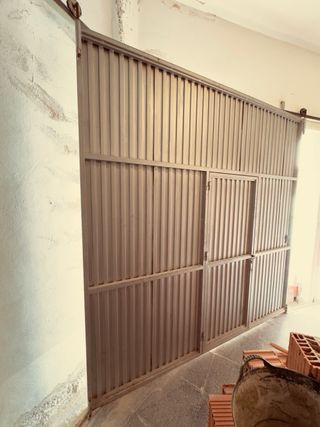 Puertas para nave o garaje en buen estado. En tres láminas dos de 1,20 por 3,40 y una de 1,00 por 3,40 - Color marrón. - Diseño de lamas horizontales.