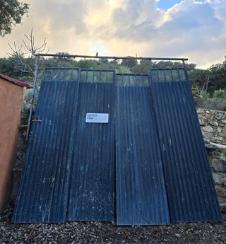 Se vende conjunto completo de puerta exterior de dos hojas, ideal para cerramientos de parcelas, fincas o naves. Estructura robusta de chapa galvanizada con refuerzo horizontal. • Medidas: 4 metros de ancho total (2m por hoja). • Incluye: Los 2 postes laterales de sujeción (fundamentales para la instalación). • Estado: Muy sólido, sin perforaciones ni óxido estructural. Mecanismo de cierre y bisagras funcionando perfectamente.