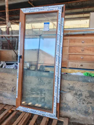 Puerta de PVC, efecto madera nogal con 1 hoja abatible en forma de arco, y cristal climalit. La puerta presenta signos de desgaste, algunas zonas del vinilo PVC está levantado, se le puede cambiar todo el vinilo o montarla tal cuál (según necesidad del comprador) tengo más puertas, balconeras y ventanas a juego Medidas: 108 x 202 x 6 SOLO RESERVO CON SEÑAL DISPONIBLES MÁS VENTANAS, BALCONERAS, VENTANAL, PUERTAS... EN MI PERFIL 🚚 POSIBILIDAD DE TRANSPORTE NO INCLUIDO EN EL PRECIO