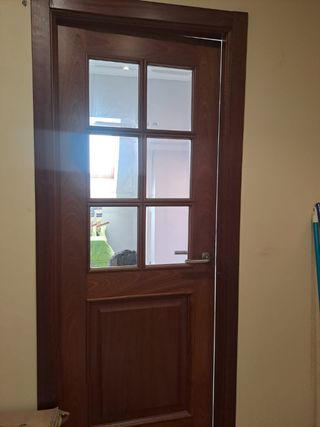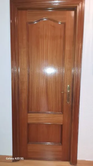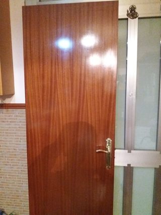 Puerta de interior de madera sapelly. - Acabado liso y brillante. - Diseño clásico con veta de madera. - Incluye manilla dorada. - una de ellas tiene llave - 3 opacas y 2 con cristal, abren hacia la derecha Precio por unidad, si te llevas todas hago precio, escucho ofertas.