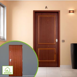 Puerta blindada con acabado en Sapelly. Ideal para reforzar la seguridad de tu hogar. - Cerradura y mirilla incluidos. - Bisagras visibles.