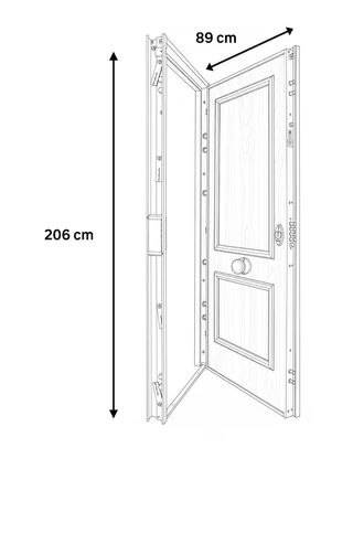 Panel exterior: Melamina sapelly liso Panel interior: Melamina blanco liso Grado 3 Medida: Hueco de obra 920mm x 2080mm Moldura no incluida premarco marco pomo redondo cortaviento automático escudo antitaladro manilla bombillo antibumping con 5 llaves incopiables mirilla (no instalada ) 9 bulones de seguridad y 3 omegas verticales para una seguridad extra. Premarco de acero galvanizado Cerradura Marca SP Ref 390-251030