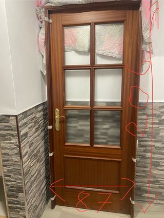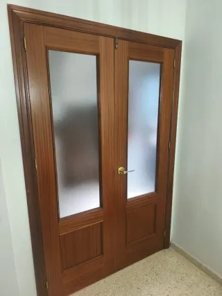 Puertas de interior de madera Sapelly. Una de ellas, con cristal. Hay cinco: 1 Puerta sapelly con cristal, 72 cm, apertura izquierda. 30 euros 1 Puerta sapelly grande 82 cm, apertura derecha. 30 euros 2 Puertas sapelly 62 cm, apertura izquierda: 20 euros cada una. ◦ Puerta sapelly pestillo 72 cm, apertura izquierda: 30 euros Todas con altura de 203 cm. No see hacen envíos. SEVILLA