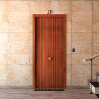 Puerta de seguridad de madera Interior sapelly liso Exterior sapelly liso Herraje dorado Medidas 203-82,5 Derechas Incluye cerco