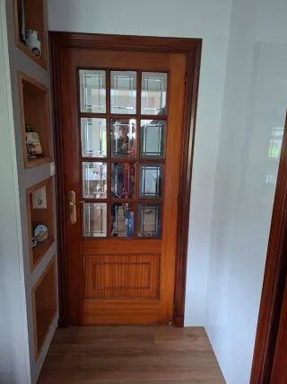 Puerta interior de madera de sapelly con un panel de vidrio. Manilla dorada. Es sólida, no hueca, y funciona a la perfección.También tengo otra puerta sin vidrio, a juego, por el mismo precio. A recoger en plaza san francisco, hay ascensor. 202cm alto y 72cm ancho