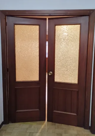 Conjunto de puertas de interior en sapelly para salón y cocina: - 1 puerta con cristal de 72 cm de ancho y 203 cm de alto. - 1 puerta doble con cristal de 72 cm de ancho cada hoja y 203 cm de alto. Desmontaje y transporte por parte del comprador. Las puertas están en un piso con ascensor en Avilés.