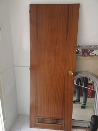 Puerta de madera de Sapelly. De Uniarte. Es sólo la puerta ciega, tengo los tapajuntas y algunos galces. Rejilla de ventilación. Abre a izquierdas. Lleva picaporte, bisagras y manetas, en dorado. Lleva 3 bisagras. Medida: 72X203 cm.