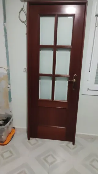 Puerta de interior en block de 70 cm con diseño de 6 cristales. Vendo puerta de interior en block (70 cm) con diseño de 6 cristales, en buen estado (apertura dcha.) Incluye: hoja + marco + tapetas + herrajes (bisagras y manilla). Medida de hoja: ~ 725 mm (“block” tabique estándar) Altura: ~2030 mm ("block estándar) Acabado: (madera alma llena, barnizada, color sapelly...) Estado: usada, pero bien conservada; sin daños importantes; normales signos de instalación previa. Recuperada de inmueble adquirido para reforma integral. Ideal para reforma o sustitución de puertas interiores en vivienda. A recoger por el interesado en inmueble.