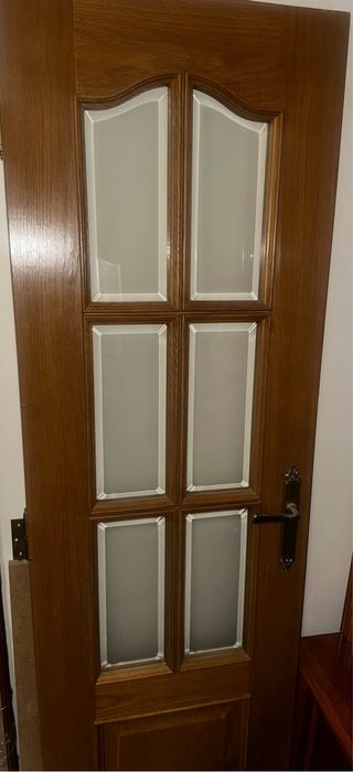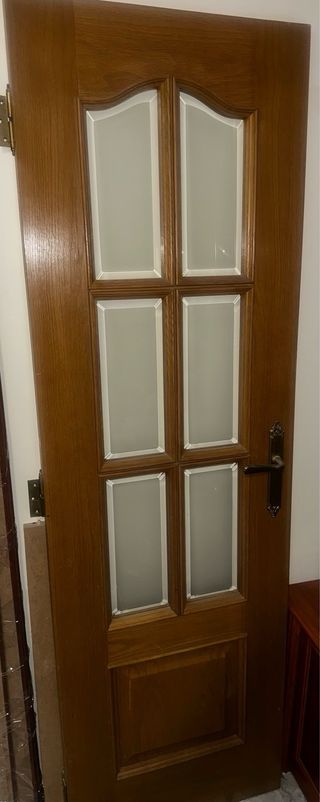 Puerta de madera con un panel de cristal esmerilado. Medidas: Alto 210 Ancho 88,3 Fondo 3,5 - Marco de madera. - Tirador metálico.