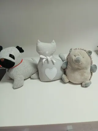 Conjunto de tres topes para puertas con forma de animales de peluche. Son ideales para evitar que las puertas se cierren solas. - Diseño de perro, gato y erizo. - Material de peluche suave.