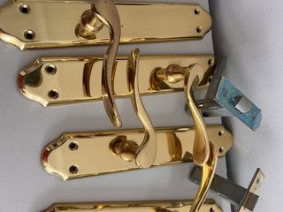 Conjunto de siete manillas para puertas, fabricadas en latón. - Diseño elegante y funcional. - Acabado en latón pulido. ¡¡¡OJO!!! Necesitan una mano de pintura.