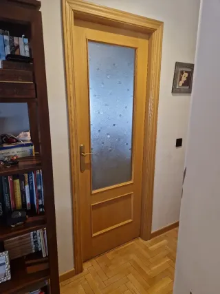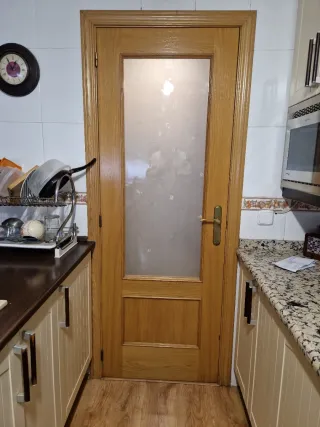 Conjunto de puertas de madera maciza con acabado en color roble. Ideales para dar un toque cálido y elegante a tu hogar. - Material: Madera maciza - Acabado: Color roble - Diseño con paneles de cristal esmerilado El precio es por unidad, las básicas. Puerta de cocina ( la de los cristales) son 130€ Puerta doble (foto principal, con cristales, a izquierda) 200€ con la ventana que aparece en la foto Hay 5 unidades a derecha (incluida la de cocina) Hay 2 unidades a izquierda SE VENDEN CON MARCOS (como en la foto aparecen) También cuento con los rodapiés (preguntar)